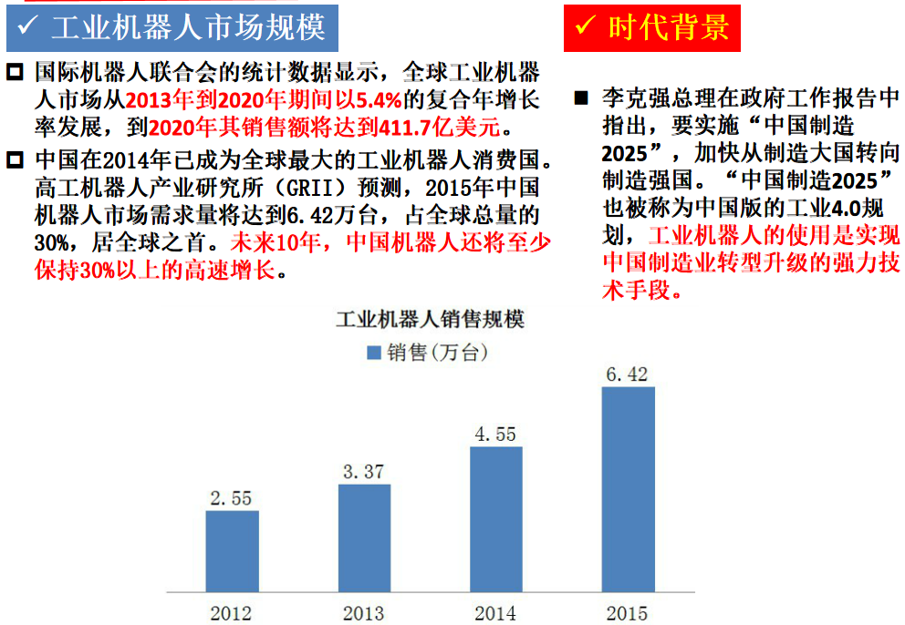 2015年5月,我国出台了《中国制造2025》纲领性文件,这份文件主动适应了制造业潮流发展,推动中国制造向智能制造转型,这为工业机器人的发展奠定了良好的基础。工业机器人能在人的控制下智能工作,可完美替代人力在生产线上的工作。与人力相比,工业机器人具备低成本、高效率以及24小时工作的特点。在制造业升级的大背景下,“工业机器人换人”提高制造业智能化程度成为新的潮流。