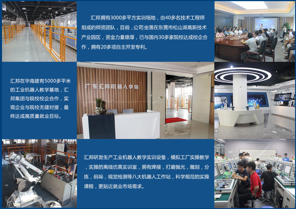 汇邦集团坐落在改革开放前沿城市深圳,主要从事机器人智能设备研发生产、自动化生产线升级欧改造、院校机器人专业建设和智能人才服务的专业化集团公司,注册资本7500万元人民币。成员包括深圳汇邦机器人科技有限公司、广东汇邦智能装备有限公司、东莞汇邦职业培训学员等10余家全资或控股参股公司。集团所属华南机器人实训基地坐落在全国四大国际机器人产业基地之一的东莞松山湖国际机器人产业园区,松山湖国际机器人产业园依托于通过打造完整机器人生态系统-------“基地+基金”模式,联结香港、内地及全球的高校、研究所、企业、上下游供应链等资源,专注机器人及相关行业的创业孵化,重点关注机器人核心零部件、机器人系统及其行业应用。今天的汇邦形成了机器人投资、研发、生产、培训、就业等完整的服务体系。