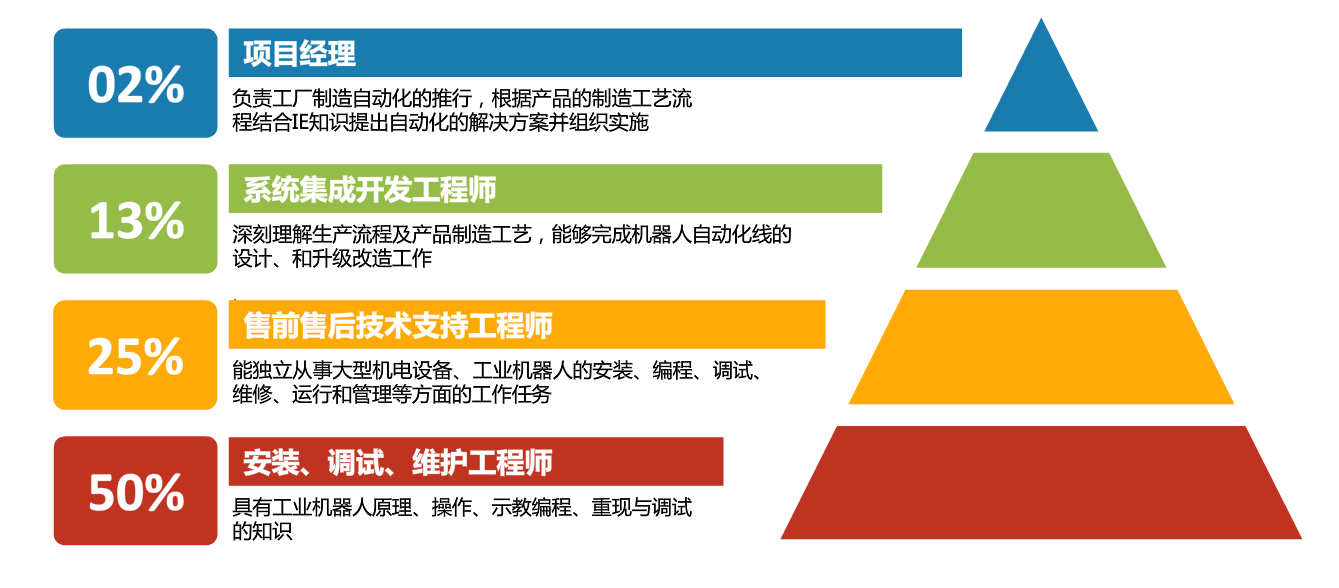 安装与调试岗:从事工业机器人本体装配、工作站安装调试工作,适用机器人应用和生产企业