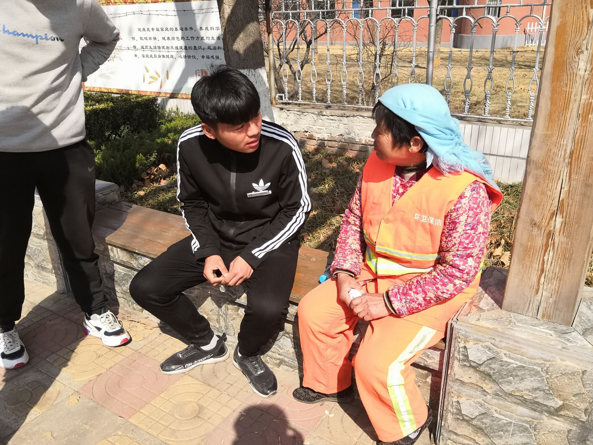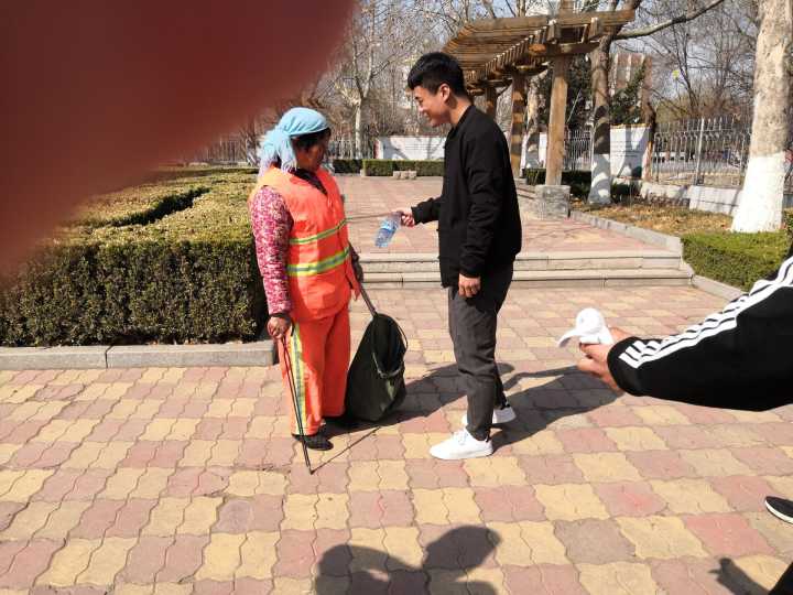 再找到环卫工人后为辛苦的环卫工人送上了水,毛巾等公益用品,与环卫工人谈心,帮助他们解决手头的问题,完事后与他们合影留念。