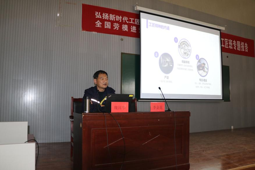 为贯彻落实《国家职业教育改革实施方案》,学习大国工匠精神,创新创业领军人才,培养并传承工匠精神,365官网365英国上市官网特邀全国劳模魏国华先生,于2021年3月25日在6号教学楼108室为师生开展了一场以“弘扬新时代工匠精神”为主题的报告会。参加会议人员有365英国上市官网院长安丰金、副院长李金花,以及部分老师代表学生代表等200余人参加了此次报告会,报告会由副院长李金花主持。