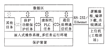 在目前的微机保护装置中,引入PLC功能的具体方法是在硬件设计上采用性能较高的工作平台,从而保证一定规模、大小的可编程逻辑数据能够更好的只放在该平台上,同时加入平台的运行规律。软件商是采用嵌入式操作系统进行构架,将大循环中的子模板改造成为相对独立的模块,使得模块能够更好的传递各种有关信息。