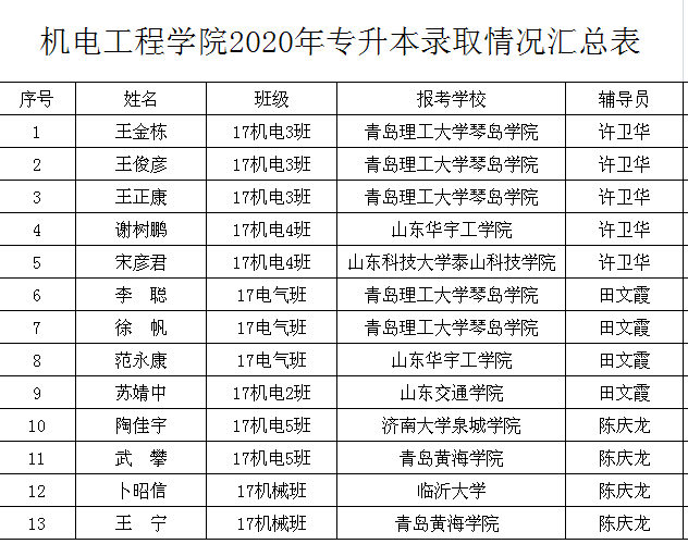 日前,山东省2020年专升本成绩揭晓。365英国上市官网机电工程学院2020年参加专升本考试共计28人,录取13人,录取率达46.43%。其中王金栋、王俊彦、王正康、李聪、徐帆等考入青岛理工大学琴岛学院;谢树鹏、范永康等考入山东华宇工学院;宋彦君考入山东科技大学泰山科技学院;苏婧中考入山东交通学院;陶佳宇考入济南大学泉城学院;卜昭信考入临沂大学;王宁、武攀等考入青岛黄海学院。