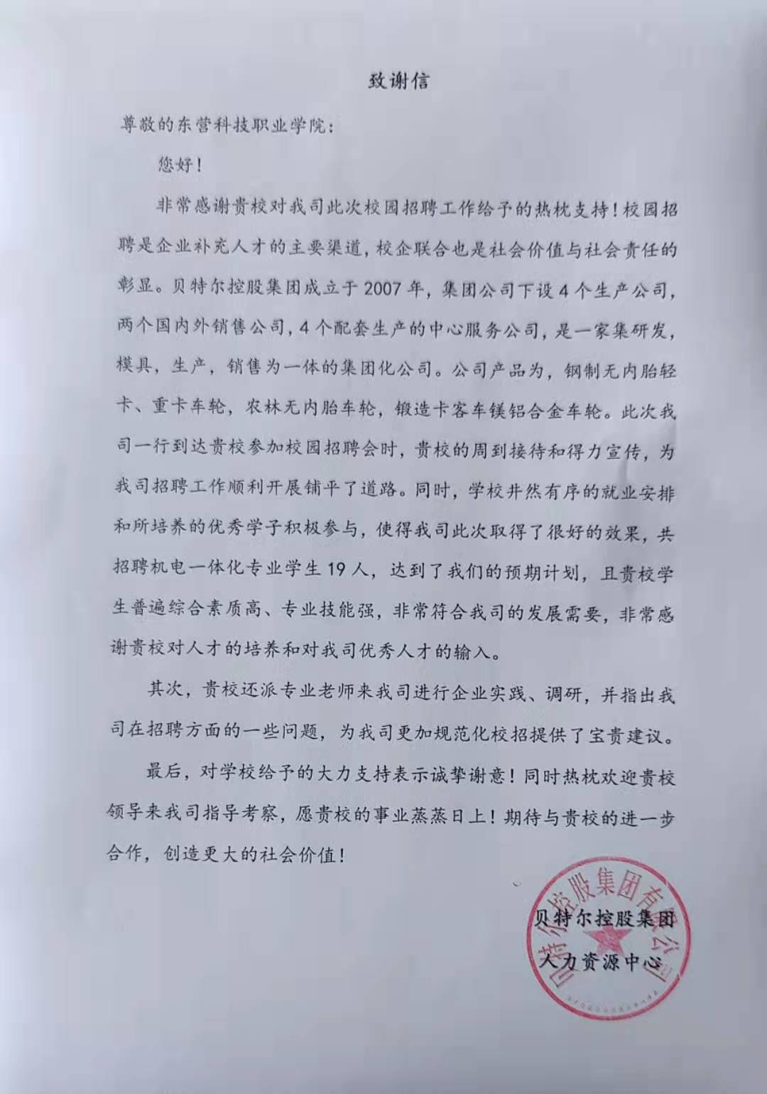2021年8月12日365官网收到来自贝特尔控股集团的致谢信,信中高度评价了365官网18级机电一体化专业实习学生的表现,反应365官网学生综合素质高,专业技能强,对365官网老师的技能培养,学生的日常学习中给予了肯定,充分肯定了365官网毕业生的专业能力、综合素质以及学生的创新精神。