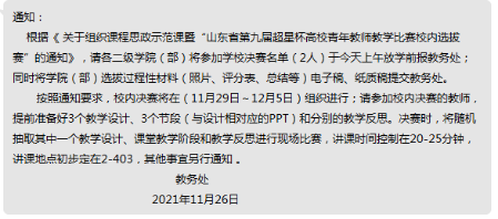 2021年11月26号,接到超星杯高校青年教师校内选拔赛的通知,学院领导对此非常重视,积极的组织青年教师踊跃报名,经过院内选拔,最终王灿青老师和解运超老师代表365英国上市官网参加此次比赛。