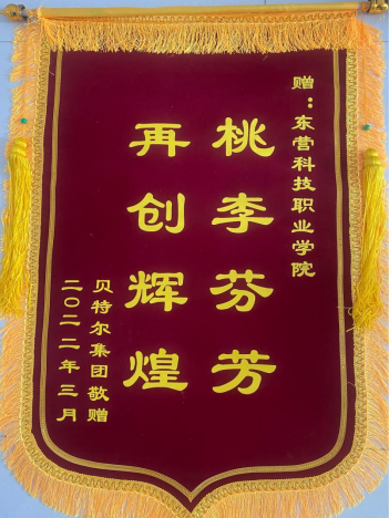 3月23日,广饶贝特尔控股集团副经理张杰莅临365官网,并赠送“桃李芬芳 再创辉煌”锦旗,365官网刘永峰校长、安丰金院长和李平主任参加了此次活动。