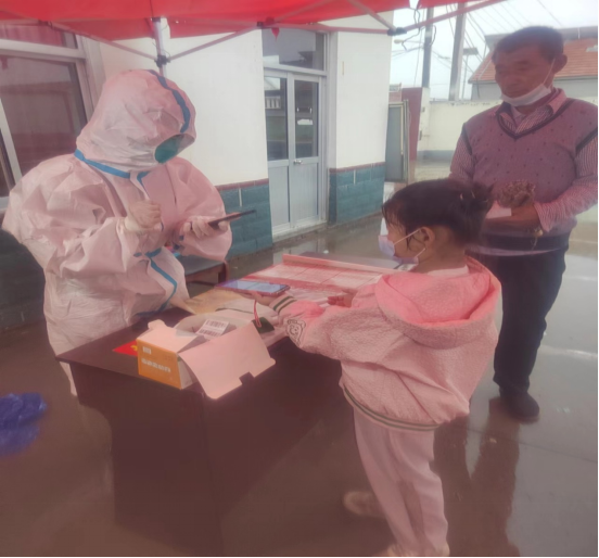 早上5点,田文静老师按照村委的要求来到村委会,正在布置场地时,突然一场大雨倾盆而下,给核酸检测带来了诸多的不便,医护人员、党员干部、志愿者冒雨坚守,核酸检测按时开始,为了加快核酸检测速度,需要一名能快速学会扫码的同志,村长问队伍里面有没有党员,田老师举手示意,村长亲自在她背后写下了“我是党员,田文静”,田老师感到非常荣幸。短暂的培训以后,田老师接过了给村民扫码的任务,群众检测队伍整齐、井然有序,齐心坚守撑起了一张“疫”往无前的守护伞。田文静老师作为党员,充分发挥了党员的模范带头作用,积极投入到疫情防控的志愿服务中去,给365官网师生做了良好的榜样。