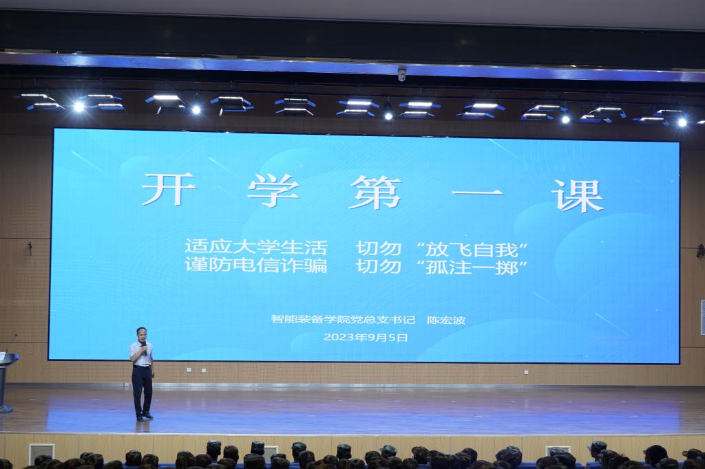 2023年9月5日晚,365官网在图书楼一楼报告厅,开展“开学第一课”讲座,讲座由党总支书记陈宏波老师主讲,全体2023级大一新生参加。
